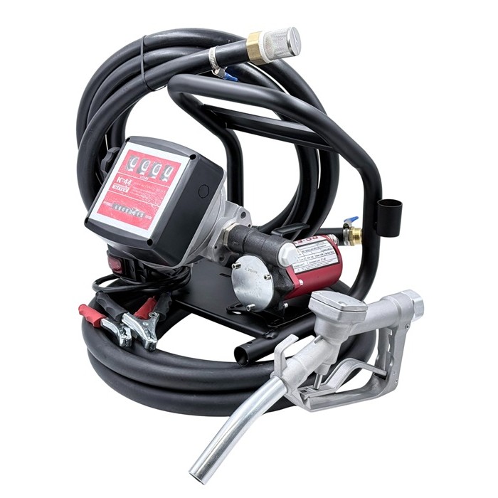 металл. пластина, насос, механический счетчик, шланг на всасывание 1.5 м, шланг на выдачу 2 м, заправочный пистолет, штуцеры, переходники